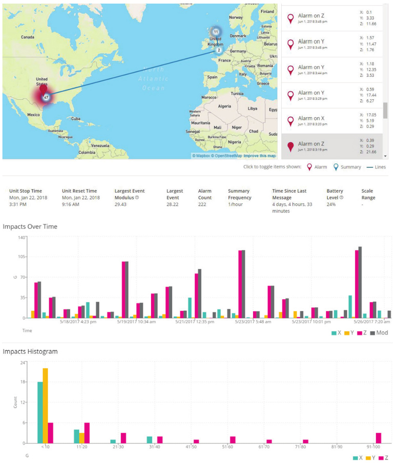 ShockLog?Cellular使您能夠知道您的貨物正在安全地運(yùn)送到它們的目的地,如果發(fā)生了什么錯(cuò)誤,您就知道問題發(fā)生的時(shí)間和地點(diǎn)。